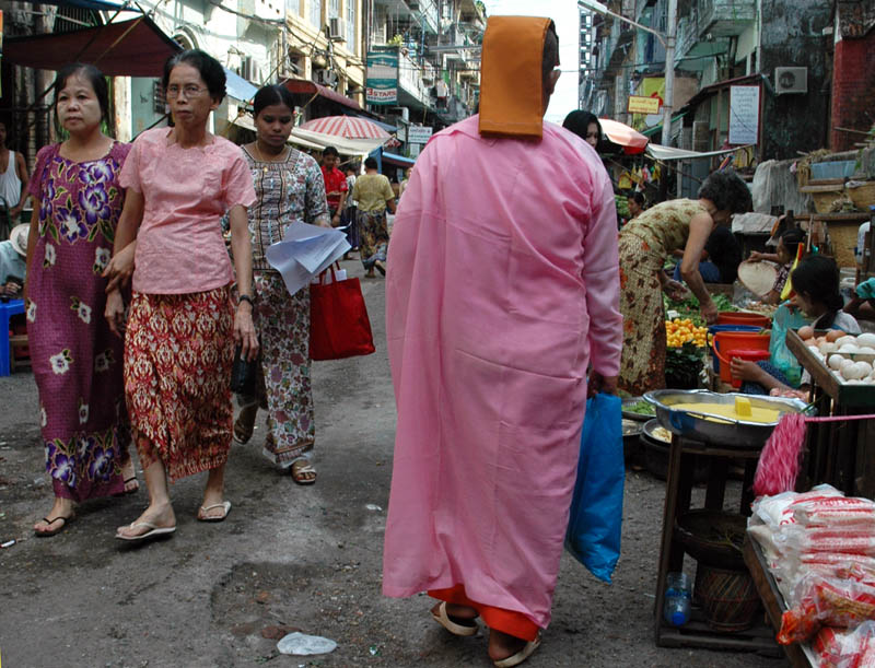 | A Buddhist nun and two dignified matrons in the streetside market |