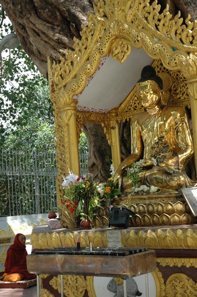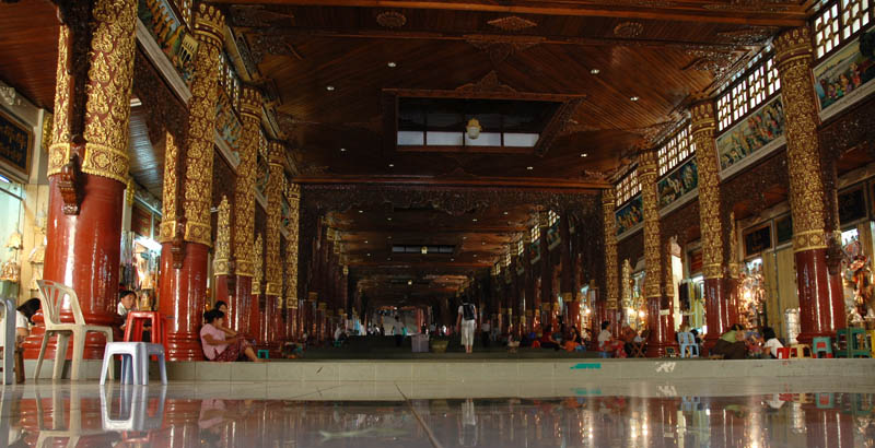 | The entrance leading up to the golden pagoda (shoes off, as always when visiting Bhuddist temples) |