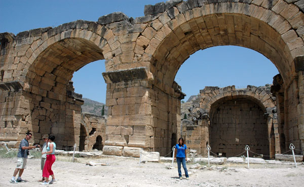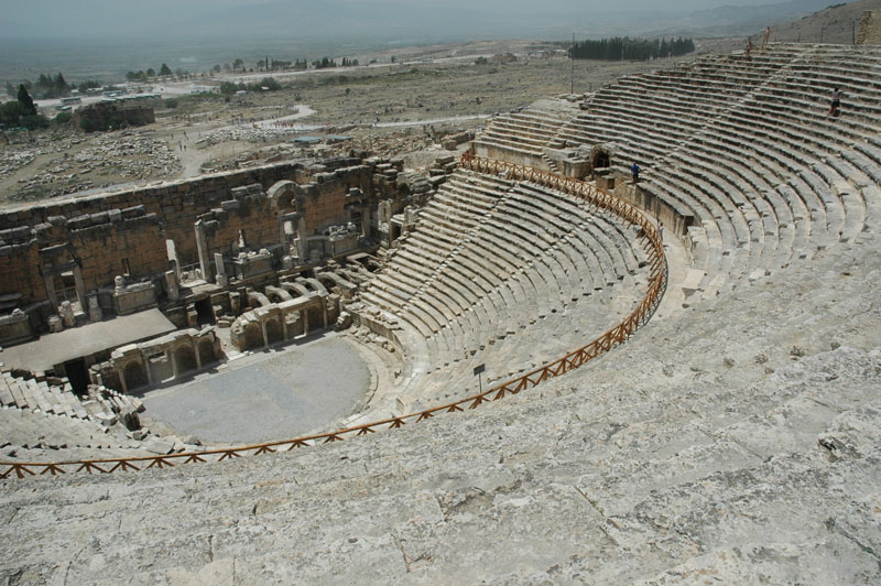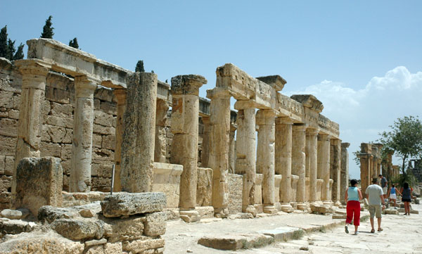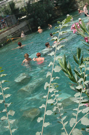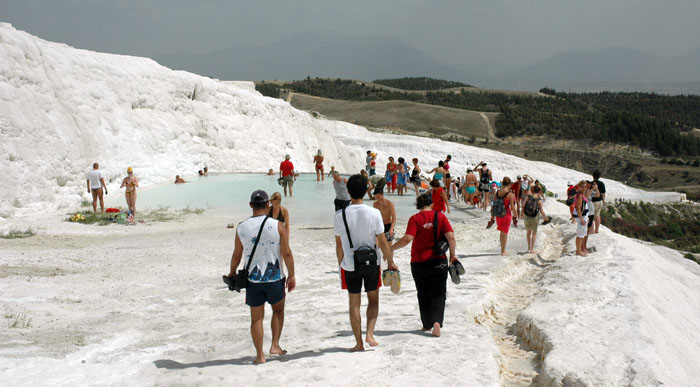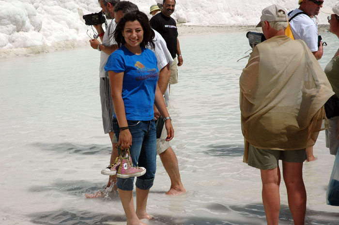 famous white cliffs of Pammukkale. Bare feet only, although some clods