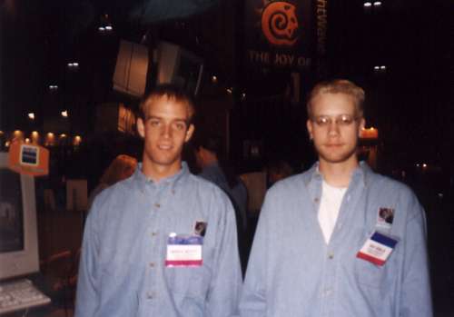 | Two talented Truespace stalwarts of the Caligari booth crew. The name tags actually cover a long number, that seems to be stenciled onto their uniform shirts. I checked with security, and they told me that they were not aware of any recent prison break. |
