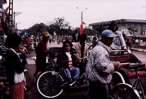 Assembling a caravan of cyclos to take our group, new bicycles, shopping bags, and people to the bus stop. The Hue central market is visible on the far right side of the street.