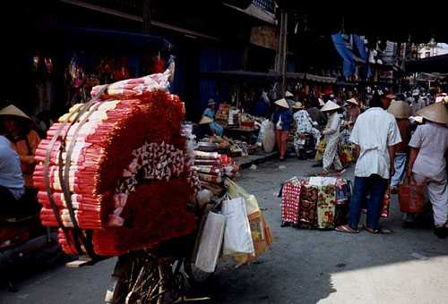 Major markets typically have an indoor as well as an outdoor part. Markets are without doubt one of the most interesting places to visit. In addition to making purchases, one may see all kinds of unusual sights, such as this bicycle with a huge load of incense sticks.