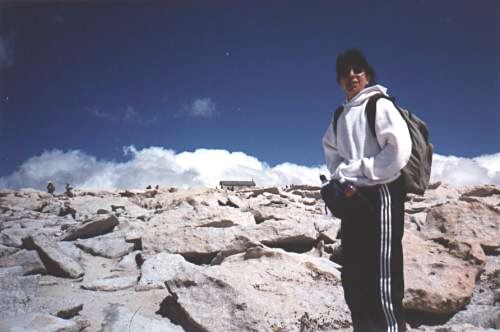 One of the marathon trainers and kinesiologist (I think). Tough, happy spirited and fun to have around. Next to her you can just see the building at the top of the mountain. The trail? You're looking at it. From here on everyone scrambled over the boulders and rocks and made their own trail.